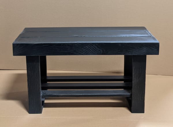 A modern twist on the paint bench! Features a linear design made up of a slatted seat and slatted 'shelf' with wider spacing.