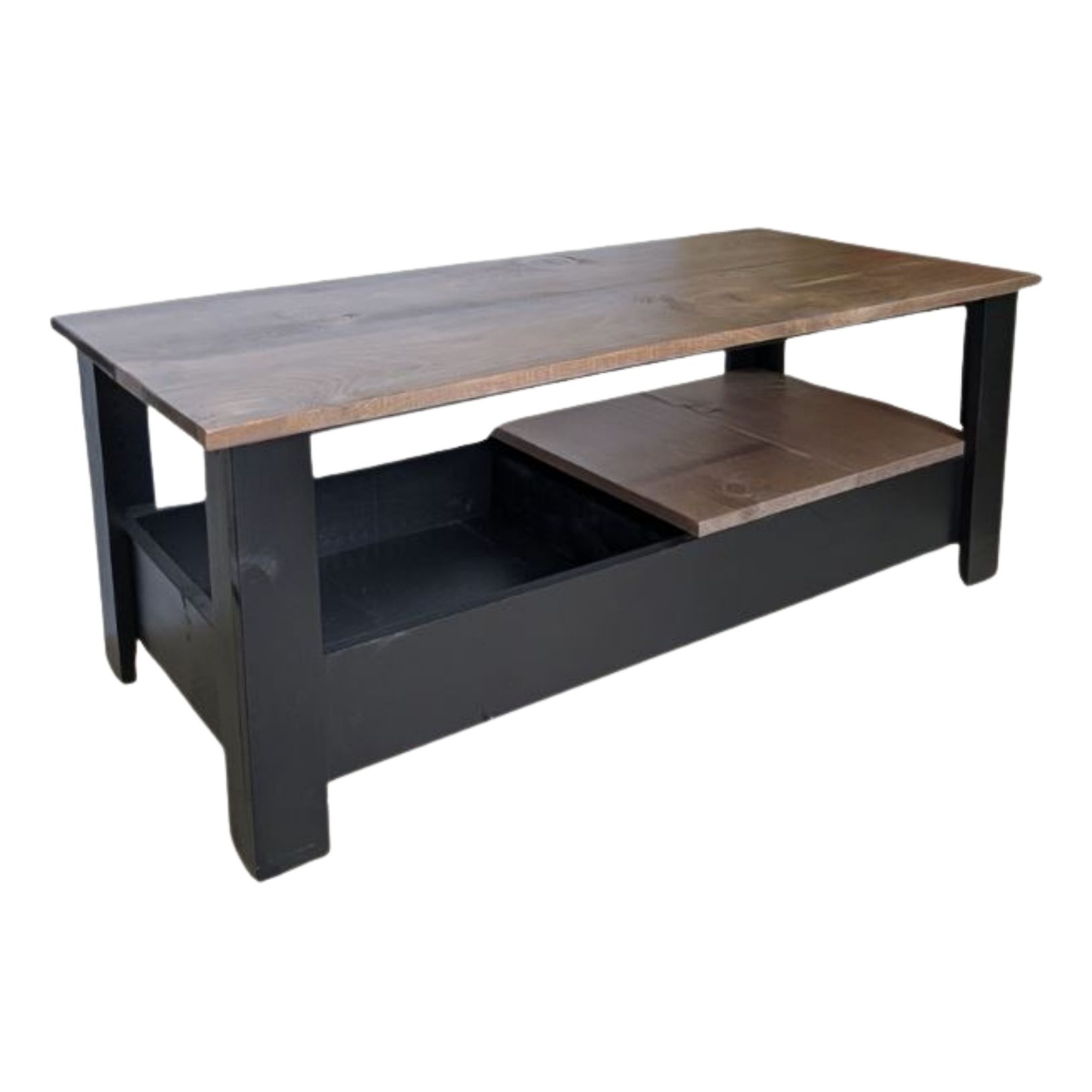 A beautiful coffee table with a unique feature: The 'shelf' is actually a topper for the lower cubby area, and it slides from one side to the other to access / hide the storage compartment underneath as needed.